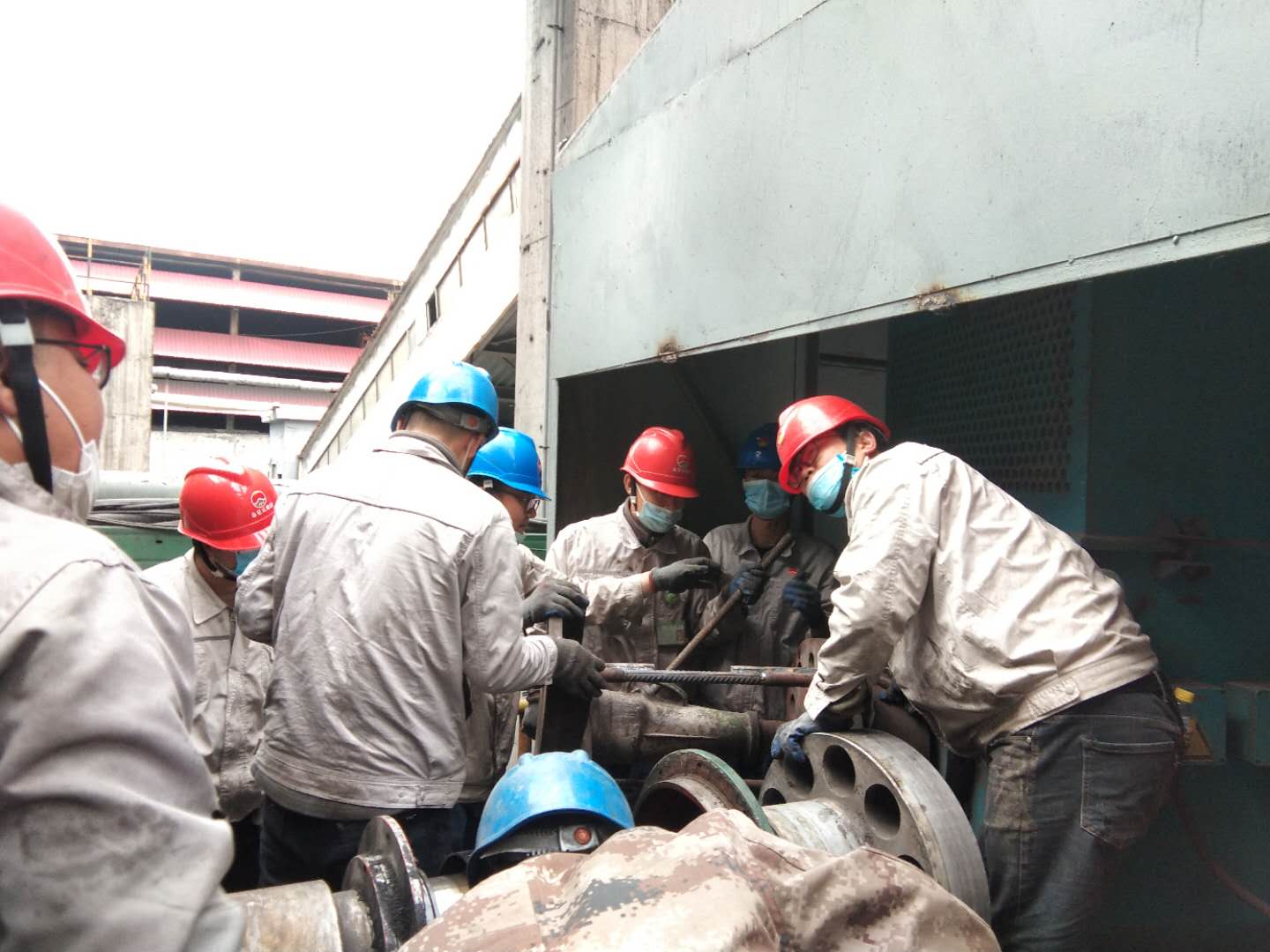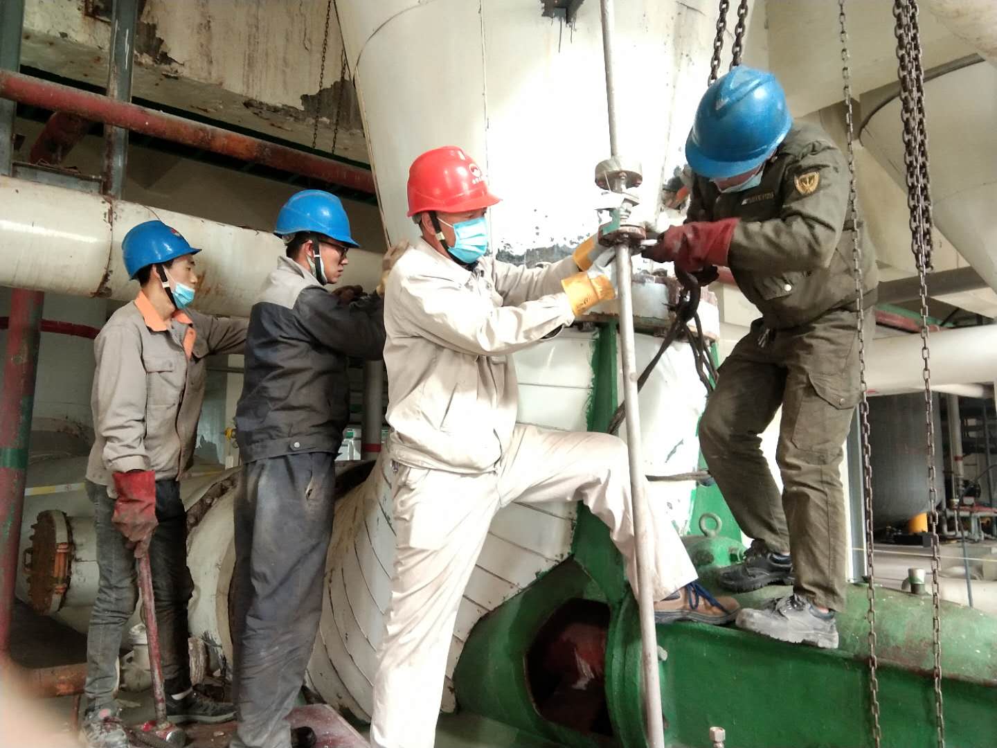 團(tuán)結(jié)就是力量。“加油,一、二、起,一、二、起……”一聲聲鏗鏘有力的口號響徹廠區(qū),這是一群可愛的人正在更換引風(fēng)機(jī)軸承的情景。