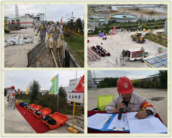 “報(bào)告總指揮,各演練部門準(zhǔn)備完畢,氯乙烯球罐單體泄漏應(yīng)急演練是否開始!薄伴_始!”隨著演練總指揮、片區(qū)副總經(jīng)理、廣拓能源總經(jīng)理賈存富的一聲令下,應(yīng)急演練正式開始!北敬窝菥氃O(shè)定為一般突發(fā)事件應(yīng)急響應(yīng),演練內(nèi)容是:廣拓能源有限公司廢酸處理稀硫酸罐排污閥泄露,由于稀硫酸泄漏量較大,啟動(dòng)突發(fā)應(yīng)急預(yù)案。主要演練現(xiàn)場警戒、人員撤離、筑壩攔截預(yù)防稀硫酸外溢、危險(xiǎn)廢物收集。